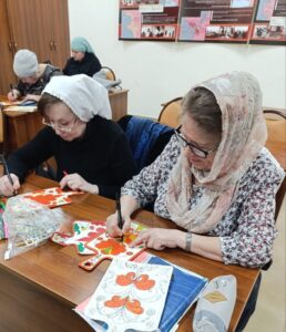 В нашем кружке «Сказочный букет» продолжается погружение в мир северных узоров. Взрослые участники на прошлом занятии продолжали работать над оформлением деревянных дощечек в технике пермогорской росписи.Каждая дощечка с каждым разом становится всё краше и краше. Это кропотливый труд: выверенные линии, традиционный трилистник, сказочные птицы… Участники работают по всем канонам старинного мастерства. Удивительно, как в руках современных людей оживают древние узоры.