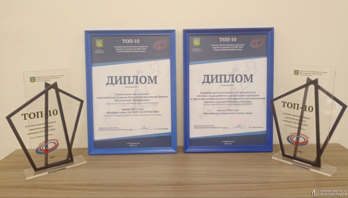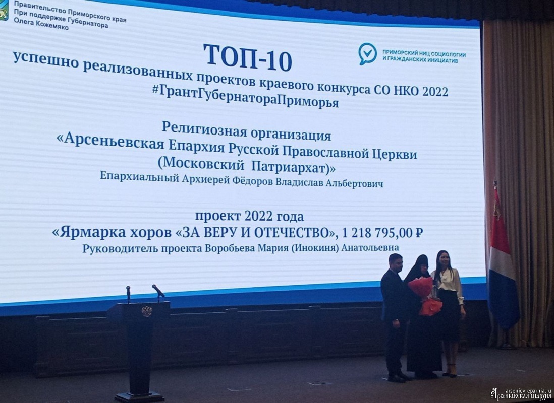 - Религиозная организация «Арсеньевская Епархия Русской Православной Церкви (Московский Патриархат)» (Епархиальный Архиерей – Фёдоров Владислав Альбертович), которая в 2022 году успешно реализовала проект «Ярмарка хоров «ЗА ВЕРУ И ОТЕЧЕСТВО» (руководитель проекта – Воробьёва Мария (Инокиня) Анатольевна). Арсеньевская епархия вошла в десятку лучших по результатам проведённой оценки и была награждена дипломом департамента внутренней политики Приморского края;