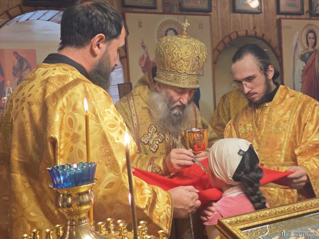 Епископу Гурию сослужили настоятель храма иеромонах Варсонофий (Рыжов) и иеродиакон Досифей (Зыков).
