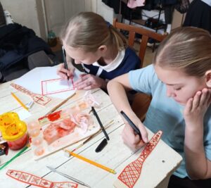 На прошлом занятии воспитанниками воскресной школы храма Архангела Михаила г. Арсеньева были выполнены деревянные изделия – лопатки, украшенные мезенскими узорами. В итоге, каждая работа стала уникальным произведением, а так же отличным подарком и сувениром для родных и близких.