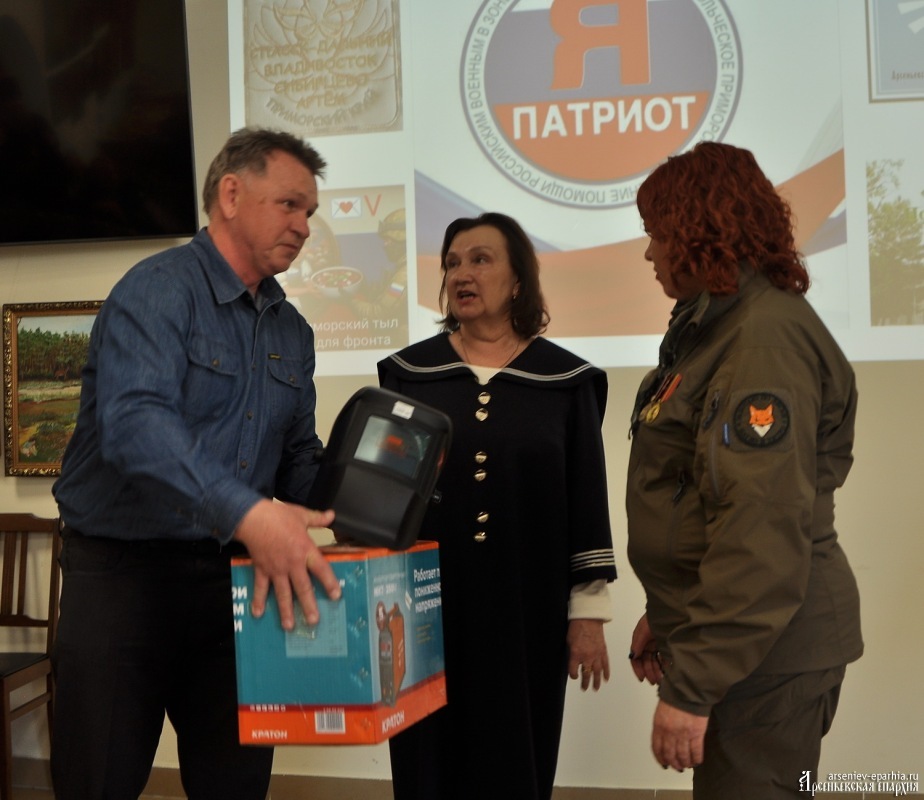 С словами поддержки выступили председатель Общественной палаты г. Арсеньева Марина Фёдоровна Маслиева и Олег Николаевич Волошенко, председатель Совета ветеранов войны, труда, Вооружённых Сил и правоохранительных органов г. Арсеньева, председатель Арсеньевского отделения Всероссийской организации ветеранов «Боевое братство», кавалер Ордена Красной Звезды. В их речи было отмечено, что в Арсеньеве действуют пункты сбора гуманитарной помощи, где жители города регулярно собирают необходимые вещи и оборудование для бойцов. Для нужд передовой Елене Михайловне был торжественно вручен сварочный аппарат, предназначенный для ремонтных работ в зоне боевых действий.