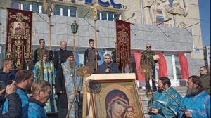 Колокольный звон, святые иконы и хоругви в руках военных и казаков, стройные ряды духовенства в голубых облачениях, за которыми разливалась широкая река православного народа с тропарями Божией Матери на устах.