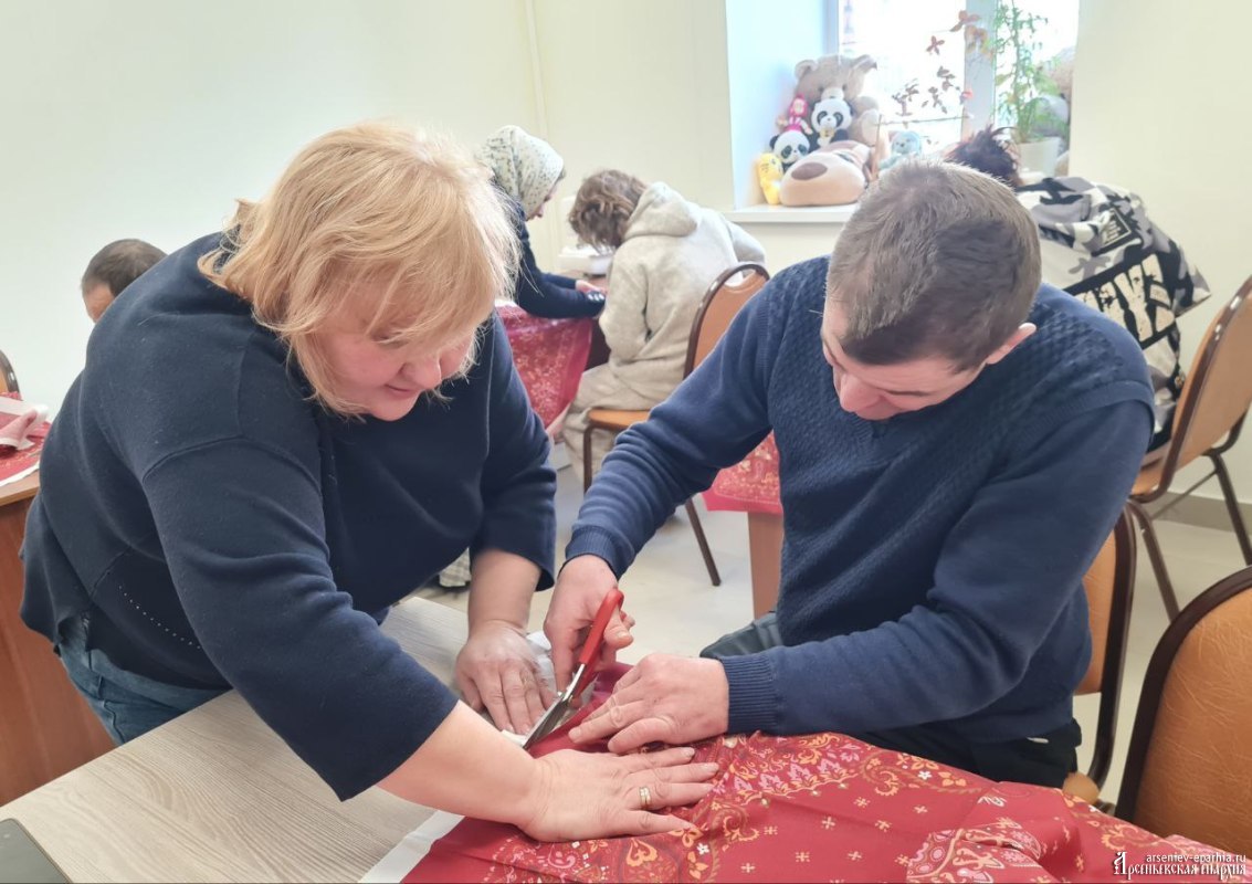Затем представители двух поколений начали изготовление куклы-перчатки и подшивали барановские платки для выступления.