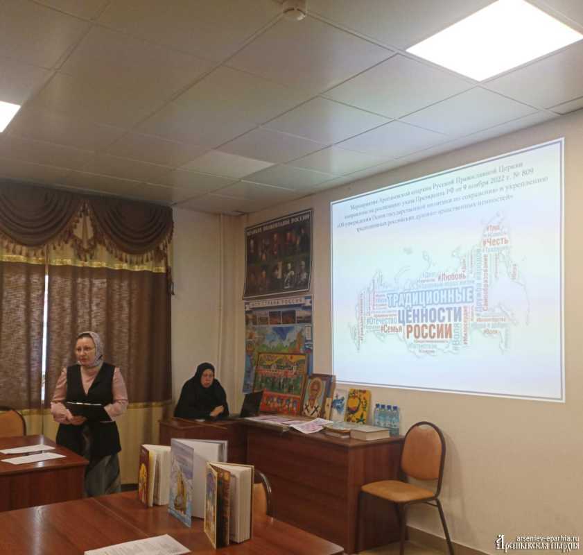 Инокиня Мария (Воробьёва), руководитель грантовых проектов Арсеньевской епархии, раскрыла понятие «патриотизм», рассказала о святынях Арсеньевской епархии и Дальнего Востока: храмах города, Порт-Артурской иконе Божией Матери «Торжество Православия», а также о святителе Иннокентии Московском и Приморских священномучениках Андрее Зимине и Павле Лазареве. Учителям были предложены разработанные сотрудниками Центра информационные и методические материалы для работы с детьми.