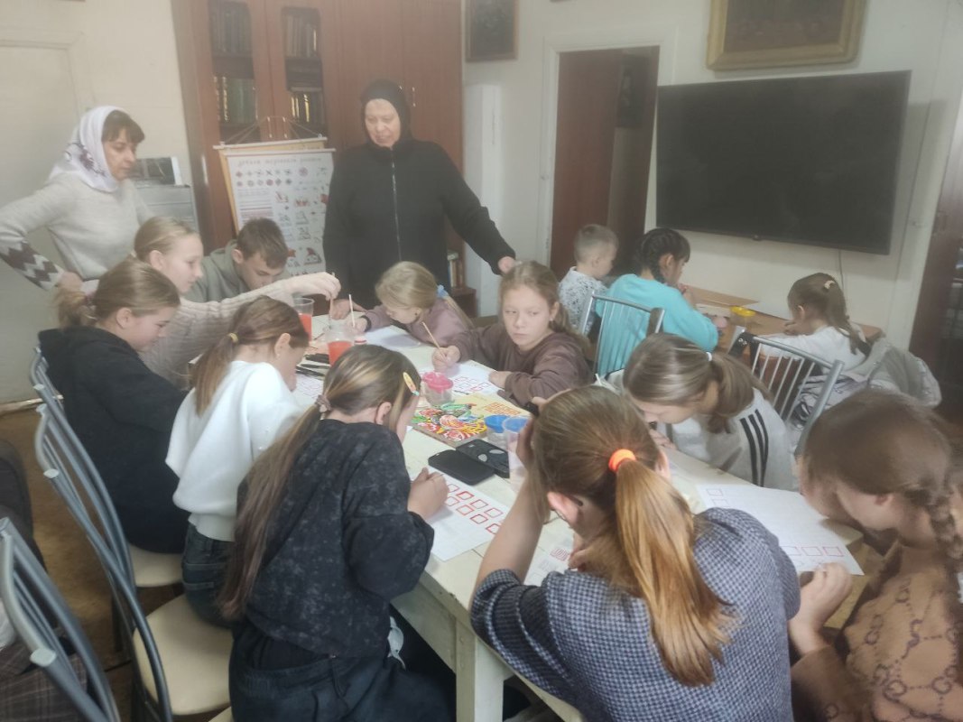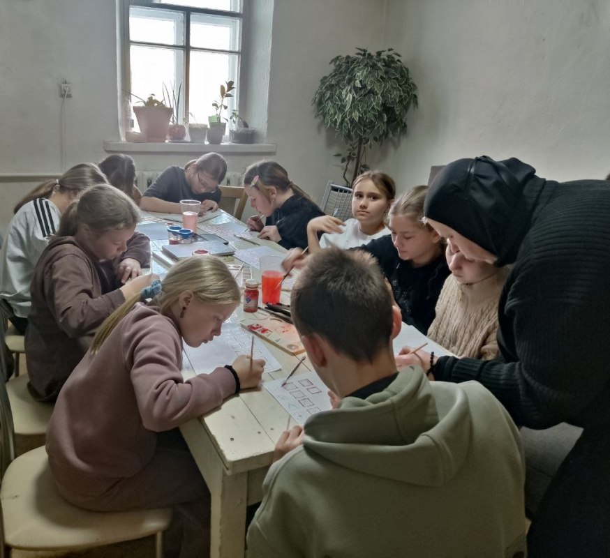 Инокиня Мария (Воробьёва), руководитель проекта, познакомила ребят с историей возникновения росписи и о её стилистических особенностях и технике.