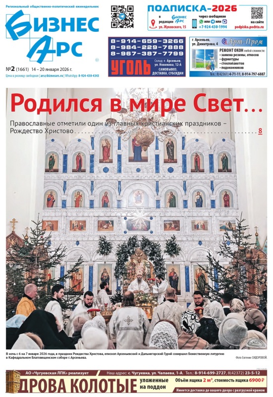 В ночь с 6 на 7 января 2026 года, в праздник Рождества Господа Бога и Спаса нашего Иисуса Христа, епископ Арсеньевский и Дальнегорский Гурий совершил Божественную литургию в Кафедральном Благовещенском соборе г. Арсеньева.
