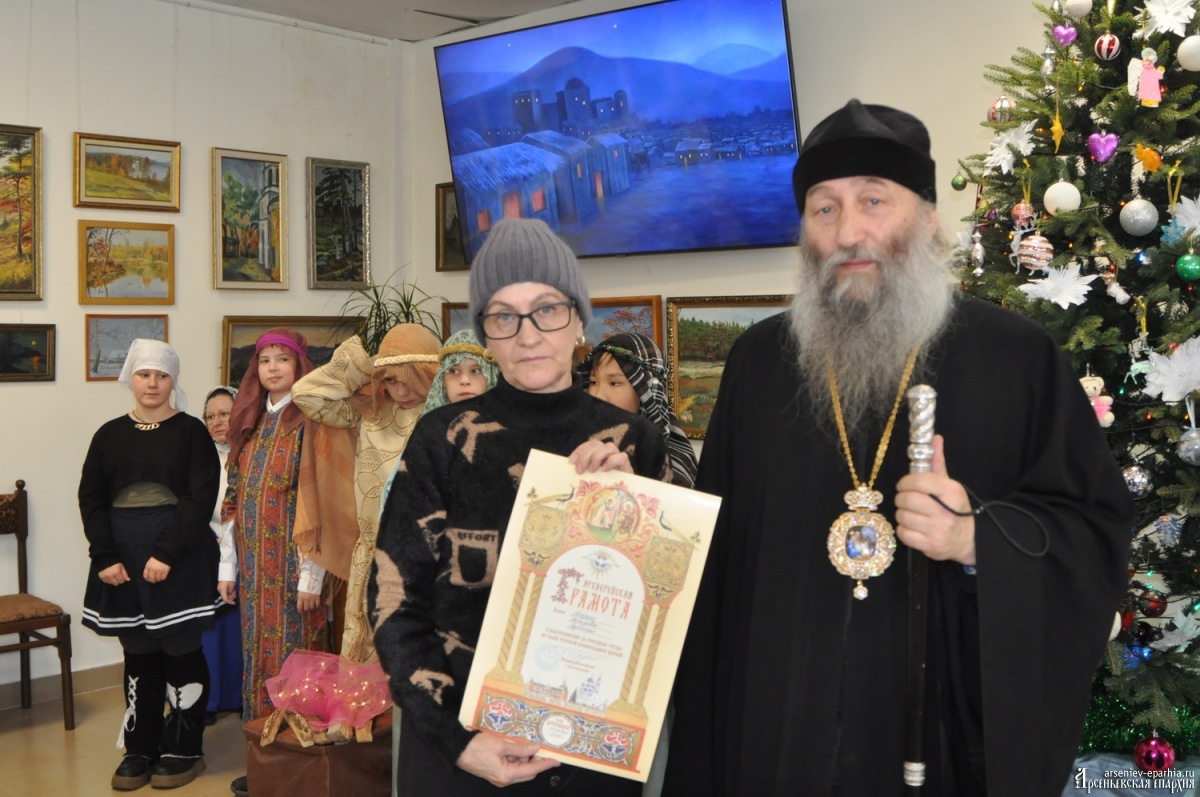 После представления воспитанники воскресной школы Благовещенского собора подарили владыке Гурию изготовленные своими руками ёлочные игрушки, оформленные в стиле северных росписей совместно с педагогами – сестрами монашеской общины. Дети из воскресной школы храма Рождества Христова преподнесли владыке Рождественский вертеп ручной работы.