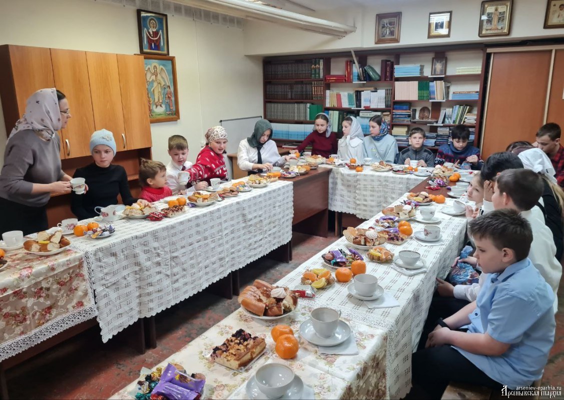 По окончании праздника дети получили от епископа Гурия сладкие архиерейские подарки и вместе с владыкой, педагогами и родителями приняли участие в традиционном чаепитии, где вновь и вновь звучали стихи, песни и колядки.