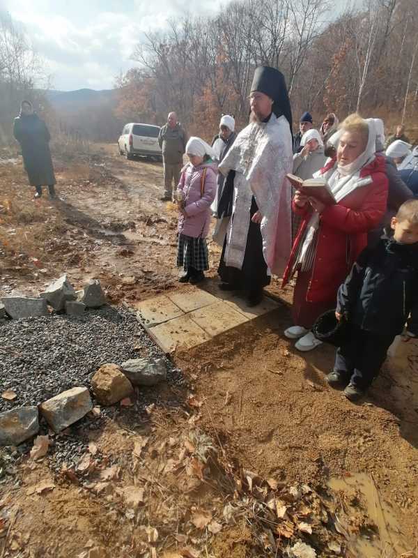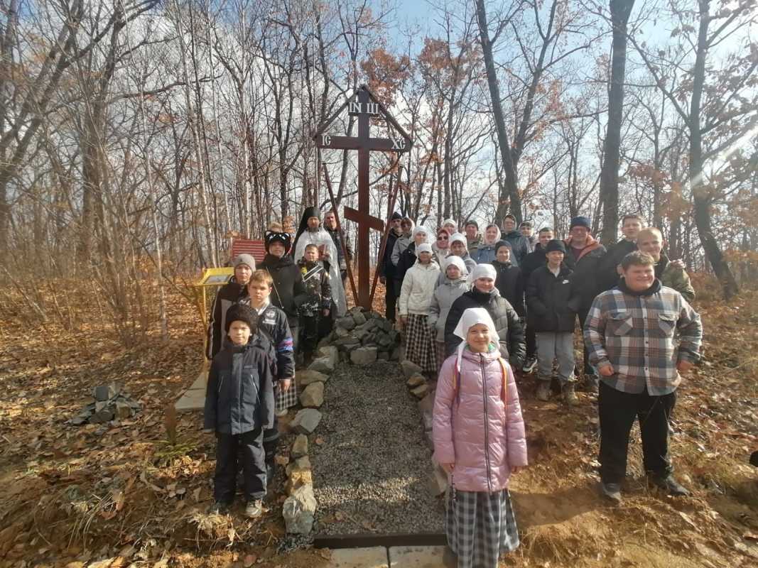 В полдень Поклонный крест был торжественно установлен и освящён иеромонахом Варсонофием (Рыжовым). За Богослужением также молились прихожане, педагоги и воспитанники воскресной школы храма Покрова Божией Матери с. Анучино.