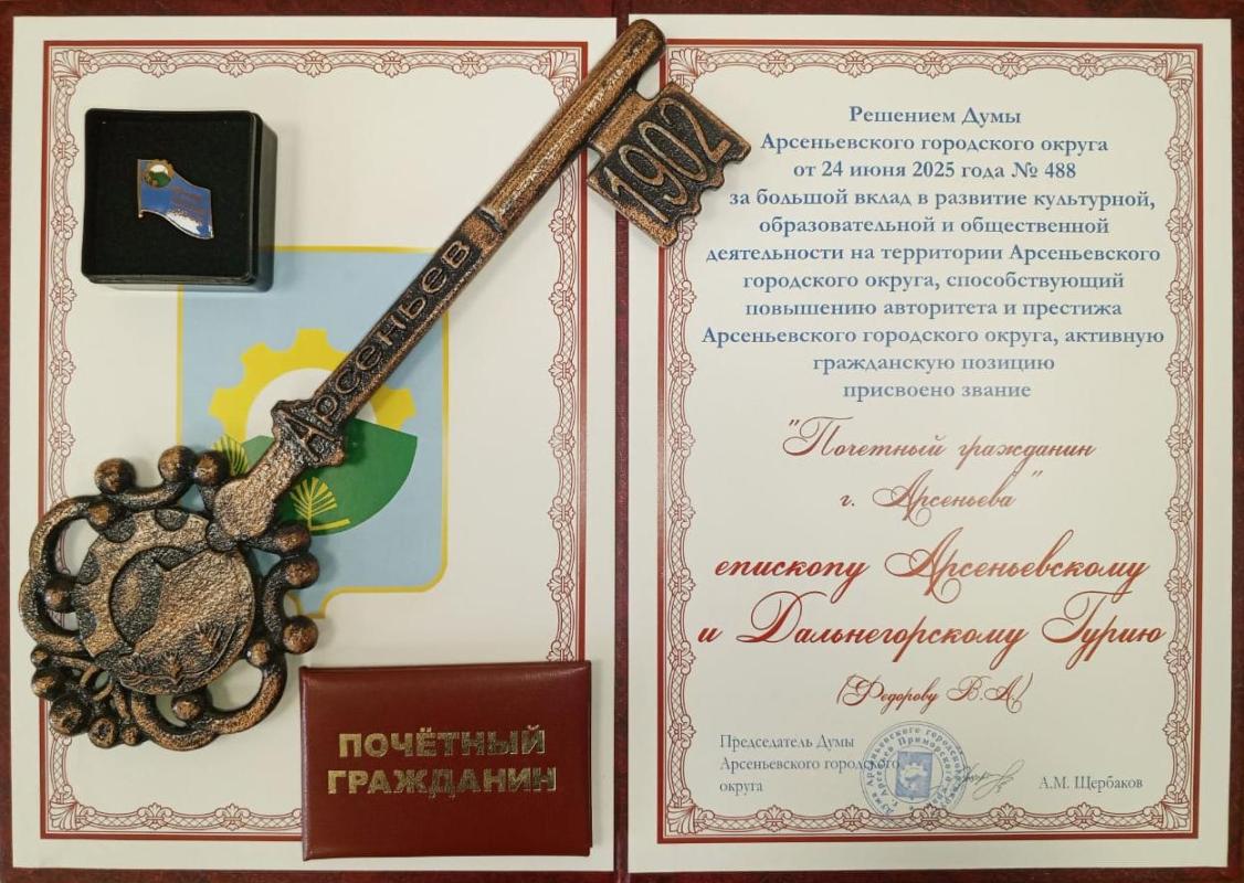 20 сентября 2025 года нашему городу исполнилось 123 года. Накануне решением Думы Арсеньевского городского округа за большой вклад в развитие культурной, образовательной и общественной деятельности звания «Почётный гражданин г. Арсеньева» удостоен Его Преосвященство, Преосвященнейший Гурий, епископ Арсеньевский и Дальнегорский.