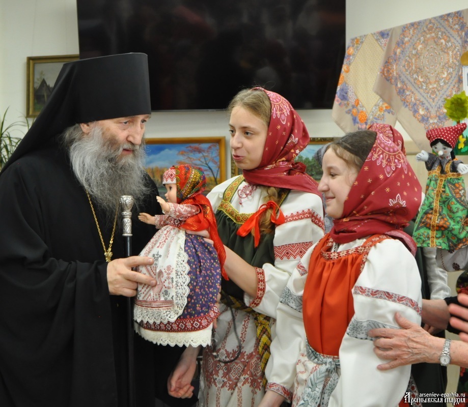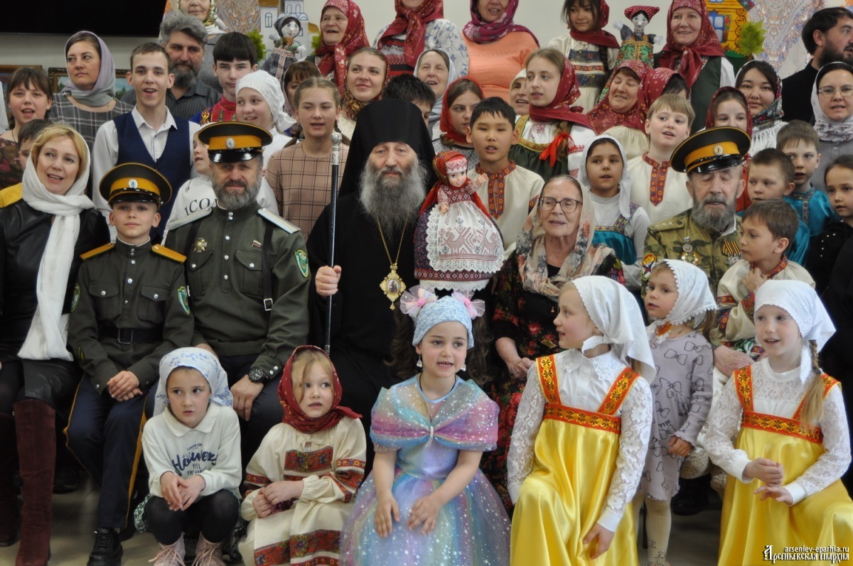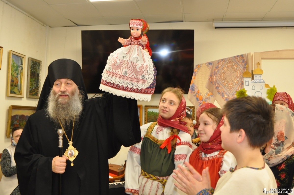 По традиции дети, взрослые и педагоги воскресной школы Благовещенского собора преподнесли владыке Гурию подарок – сшитую вручную куклу-грелку на самовар.